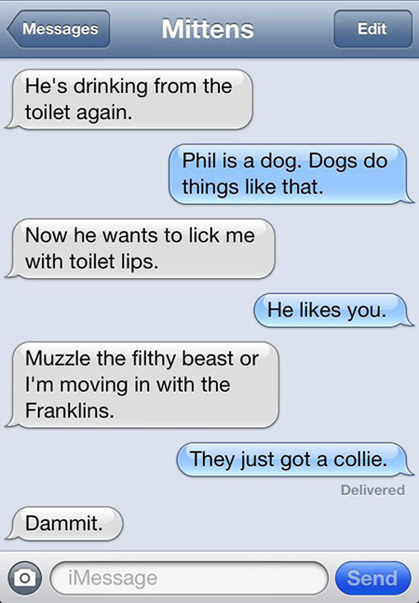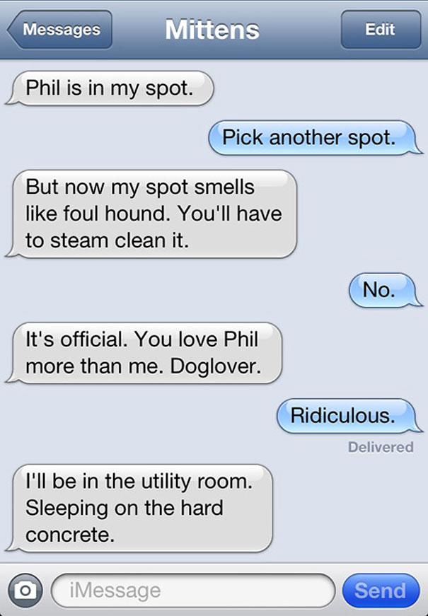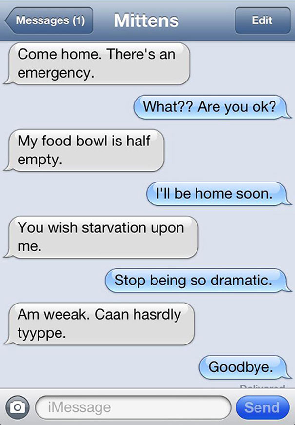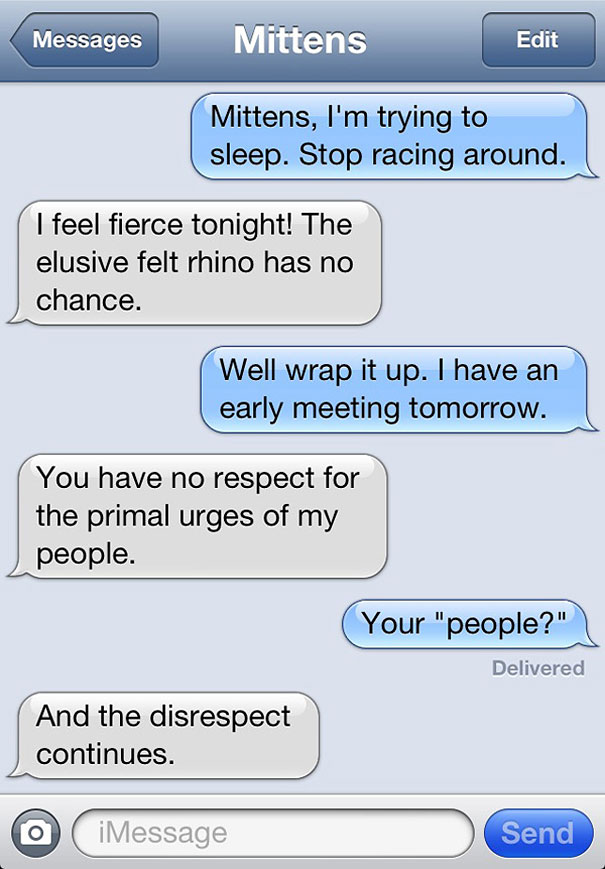 Some of the essential truths about our furry feline companions – Mittens texts written by Angie Bailey in her “Texts from Mittens the Cat” on Catster. Angie Bailey illustrates the kinds of conversations humans and cats might have if cats could text.